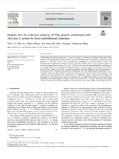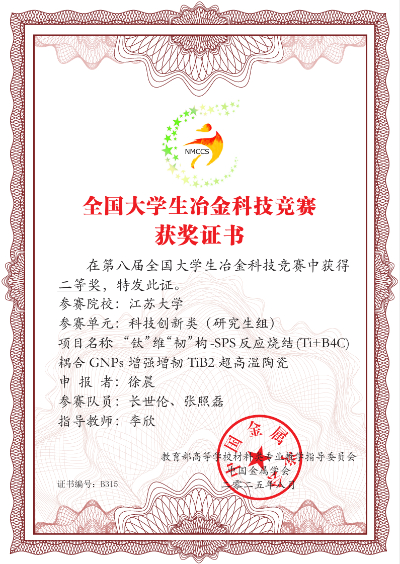 主要工作:参与TiB2粉体生产制备工艺改进,粉体性能测试与探究,利用SPS(放电等离子烧结)、热压烧结(HPS)制备TiB2基复合陶瓷,设计优化方案,并放大实验制备铝电解用可润湿性阴极陶瓷材料。